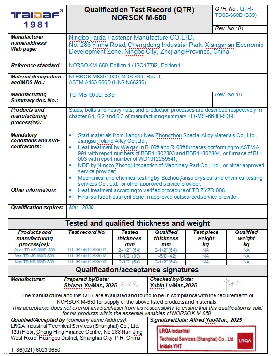 For example, in an offshore platform, thousands of fasteners are used to connect various structural members and equipment. The NORSOK M650 standard provides the necessary guidelines to ensure that these fasteners can withstand the harsh marine environment, including extreme weather conditions, corrosive seawater, and high - pressure differentials.